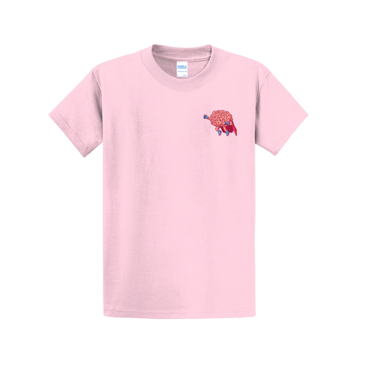 Front Design: Featuring a fun, animated brain in a superhero pose, soaring over clouds with a vibrant rainbow backdrop. This imaginative graphic symbolizes strength, optimism, and the power of the mind.