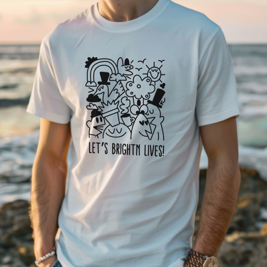 Step into a world of creativity and self-expression with our "Let's Brightn Lives" Essential Tee. This t-shirt features a whimsical design adorned with character doodles that capture the essence of a brightened life. Perfect for those who appreciate the art of layering and creating unique outfits, this oversized faded t-shirt effortlessly fuses modern trends with a hint of nostalgia.