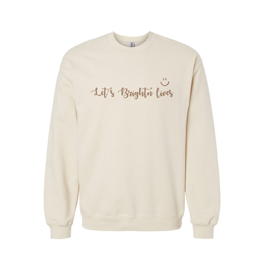 Front Design: The front center showcases the fun, cursive slogan "Let's Brightn Lives" adorned with a cheerful smiley face over the word "lives." This uplifting message is a favorite of our founder, Jeff, who passionately shares it with everyone he meets.